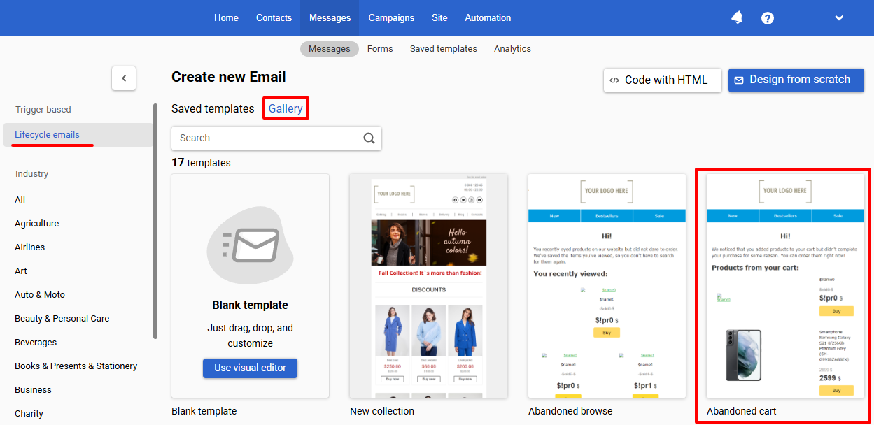 - Go to Messages and click Create email. In Gallery tab, select the template Abandoned Cart and edit it as needed.