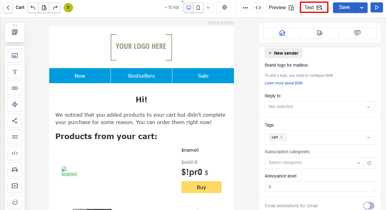 - As a single test email. Go to Messages, select the corresponding template, click Test, and send the email to your address. You can send the test email to several addresses.