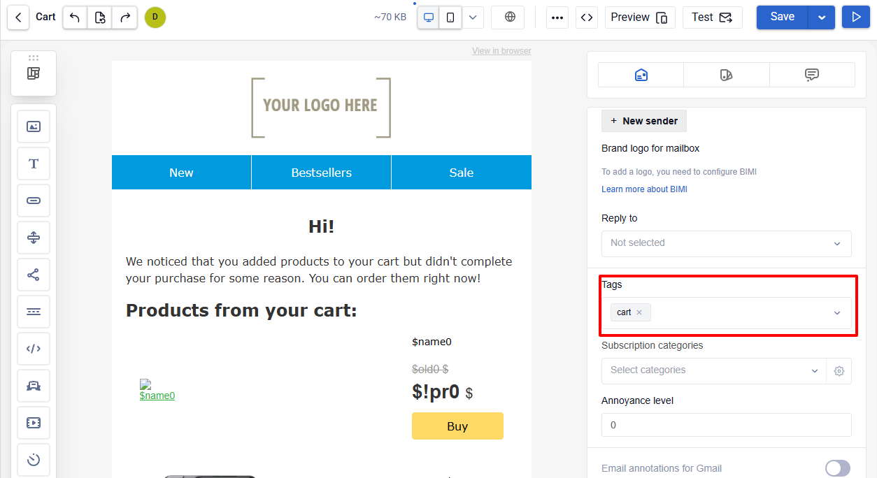 We recommend adding to your abandoned cart emails a corresponding tag (for example, cart). This will allow a faster search of emails and triggers and more convenient report assessment.