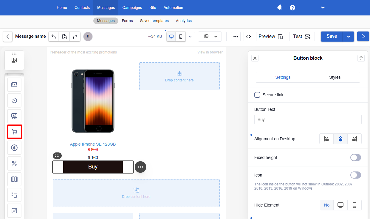 In each email, product blocks with specific recommendation algorithms will be available, and they will be saved to the module library for easy editing. Then, you can simply drag such a module to any email and edit the display of product cards if necessary. The content of short messages (Viber, Mobile Push, etc.) can be easily changed in the corresponding editors.