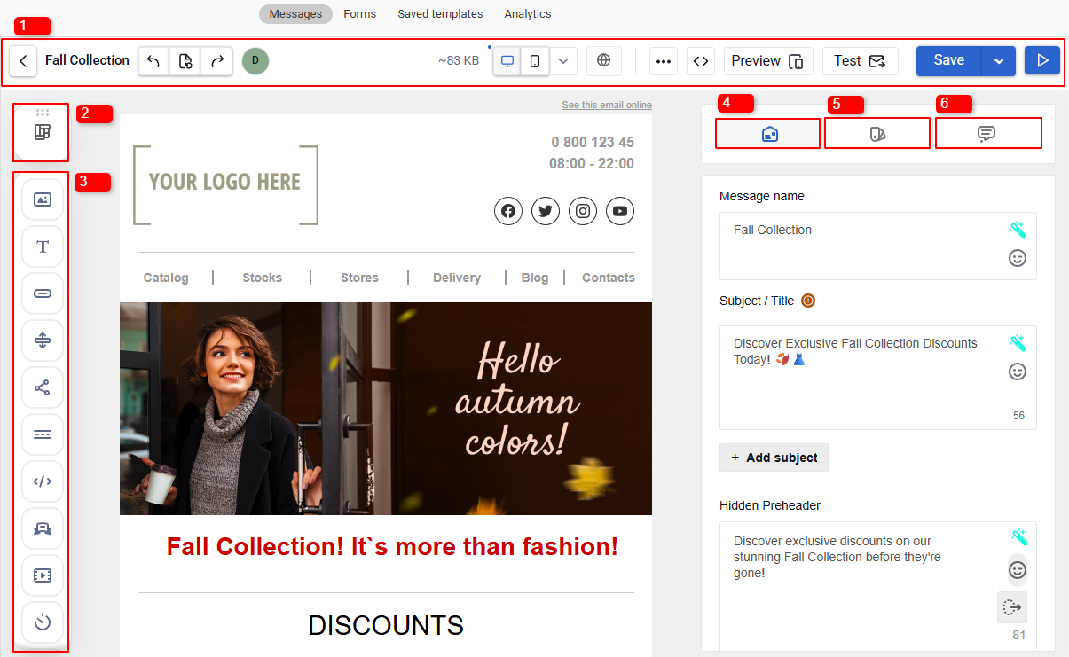 - Message Settings — set core parameters, including subject, hidden preheader, and sender name.
