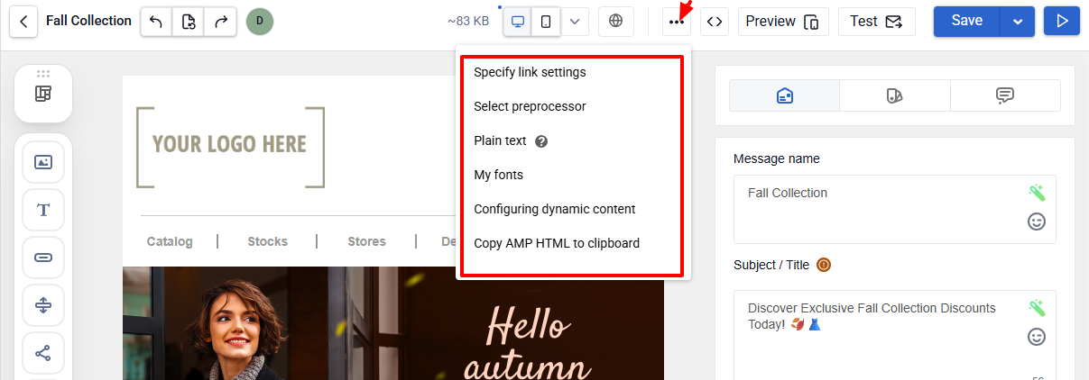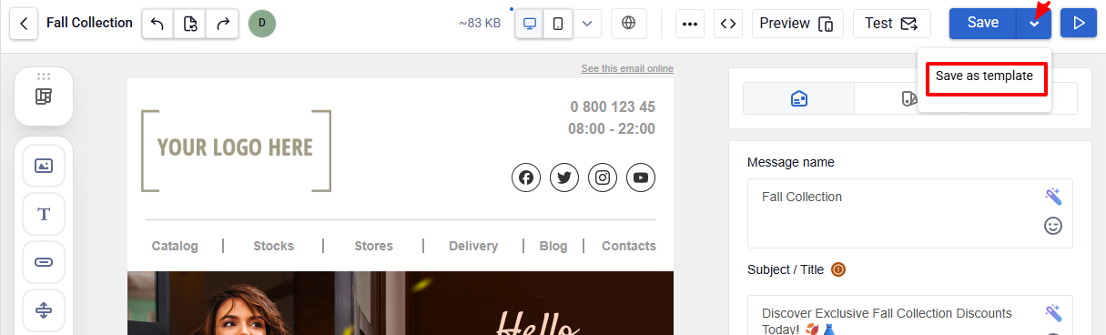 - Save — save changes and close the editor. The dropdown includes Save as template.