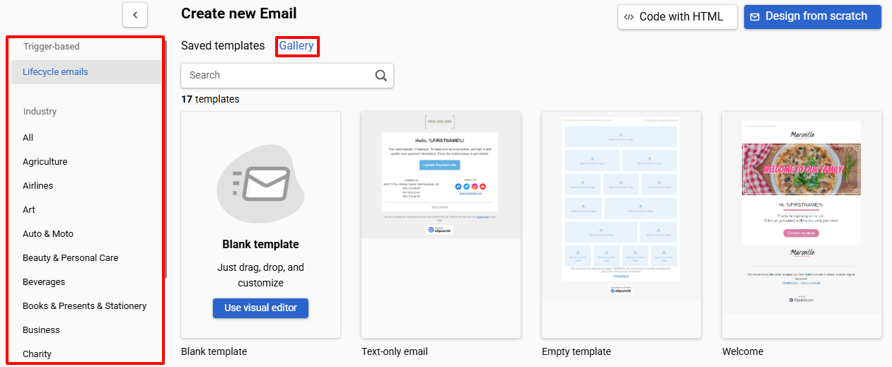- In the left panel, select the template that best fits your campaign from the available categories.