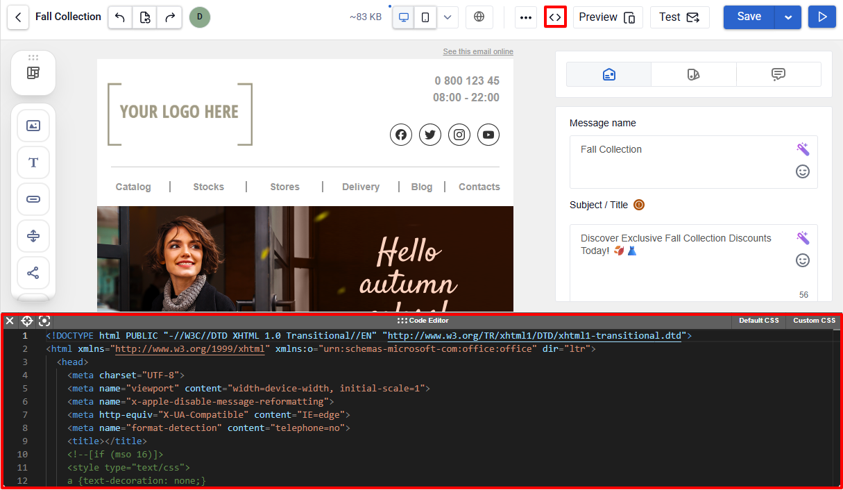 - Code editor — switch to manual HTML editing for direct code changes.