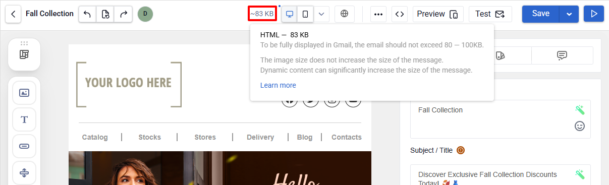 Keep the email size within 80–100 KB. Some email clients, including Gmail, may clip content if the HTML exceeds this limit. Learn more >