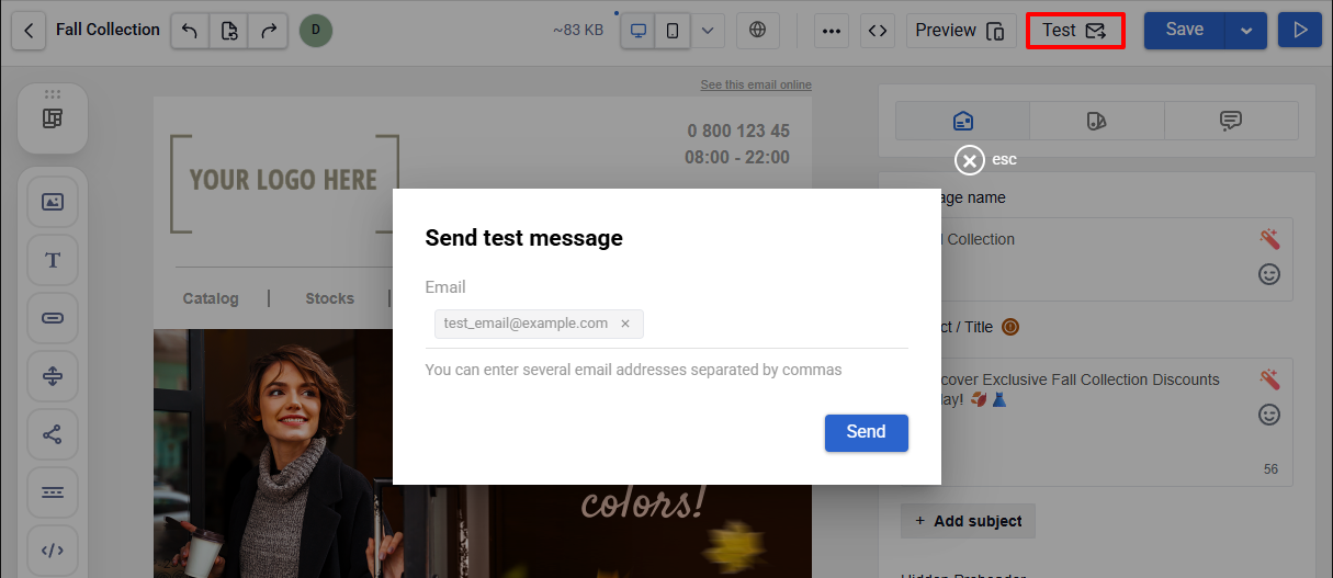 - Test — send the email to one or more addresses to verify rendering in a real inbox.