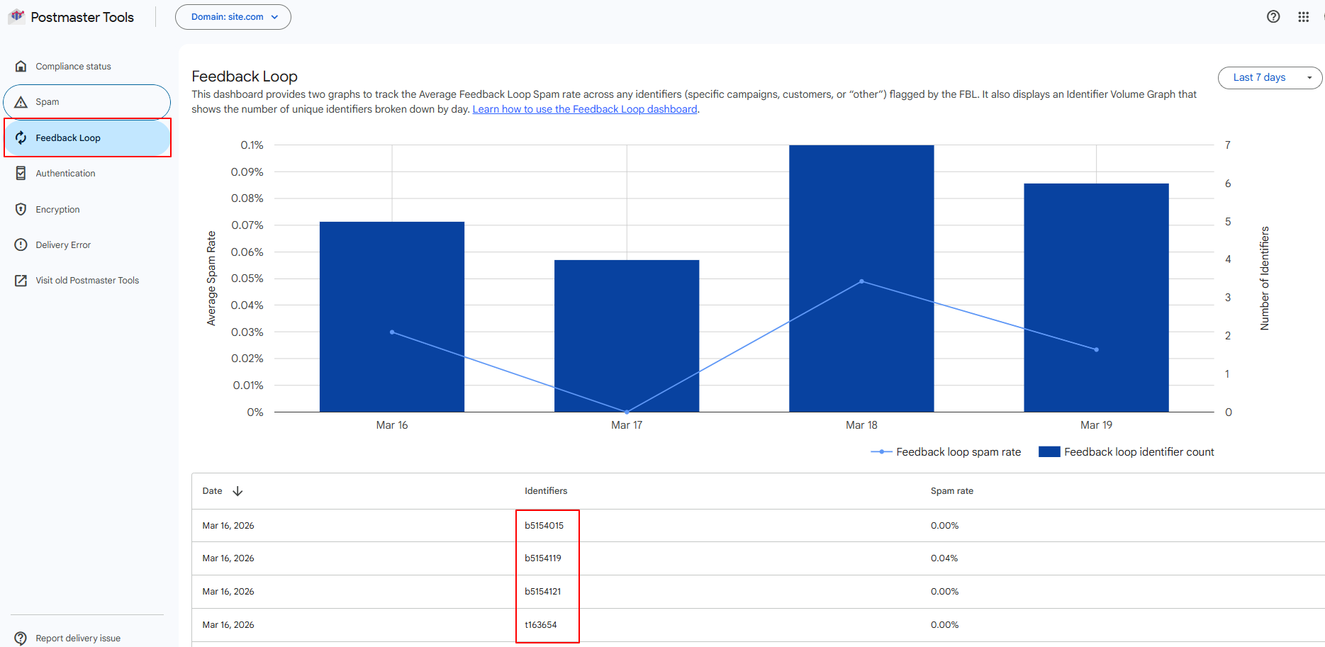 Click any data point on the chart to view campaign type IDs and their corresponding spam complaint rates. To identify which campaign triggered the complaints, go to the new version of Postmaster Tools — Feedback Loop, copy the ID, and enter it in the search bar under Campaigns — Reports — Email — Bulk/Triggered in the format cid:1234567.