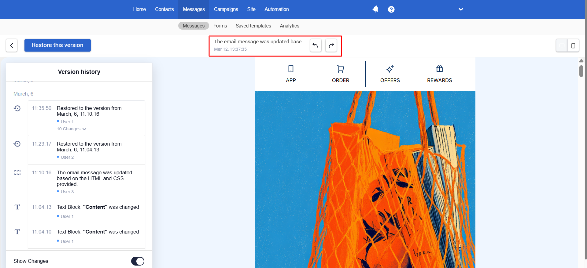 - Browse all message versions, grouped by timestamp. Expand a section to see the specific changes it contains.