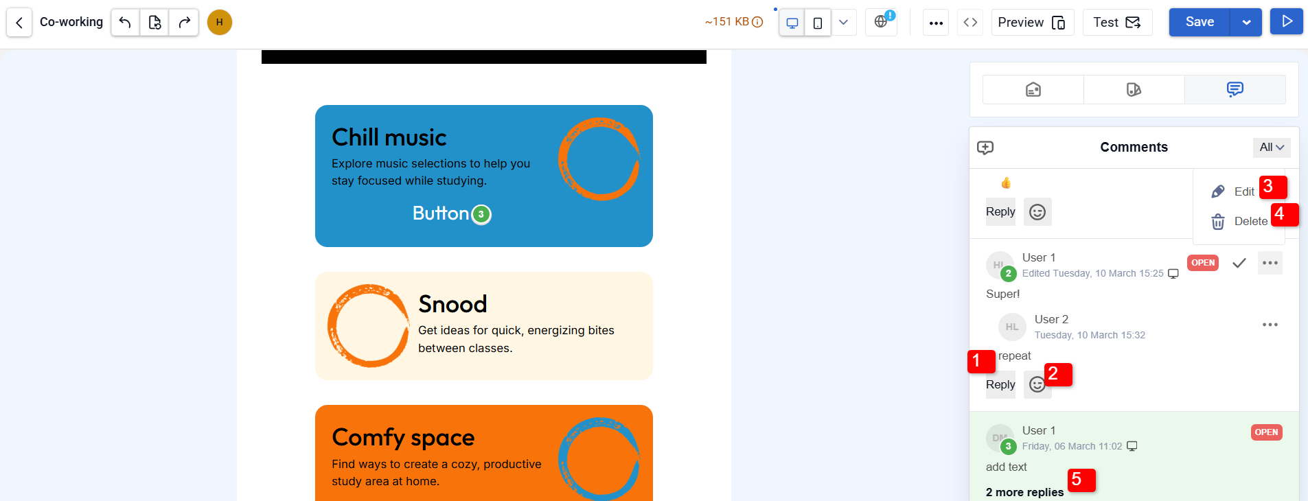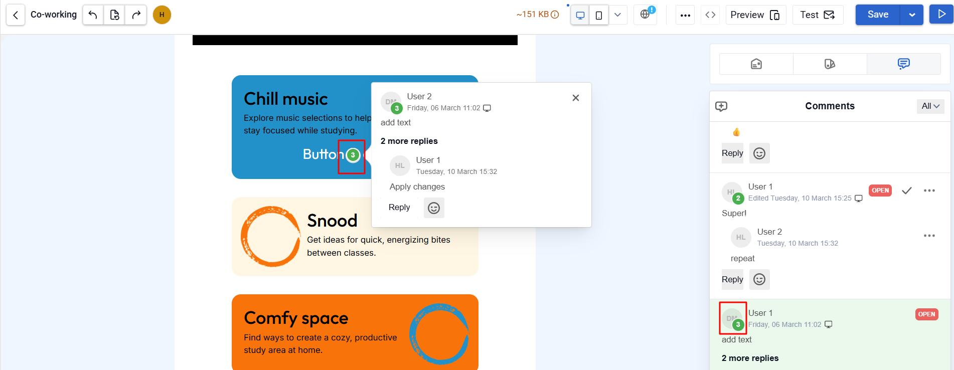 - Faster approvals. Edits and discussions are kept in one place: in the template and in element-level comments.