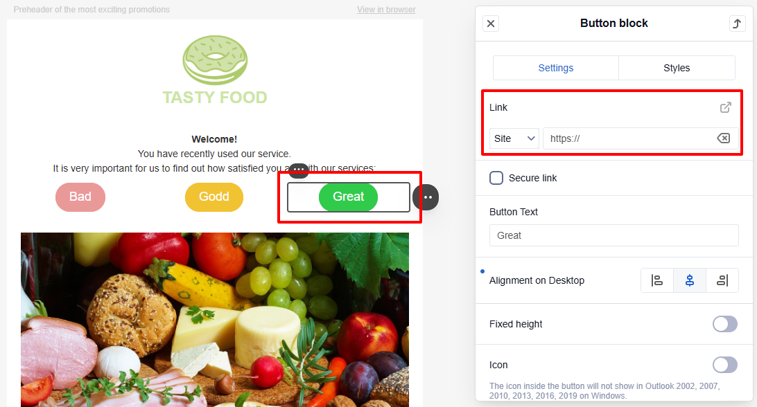 To create an extensive survey and better understand your customers, you can add a link to the survey in your email.