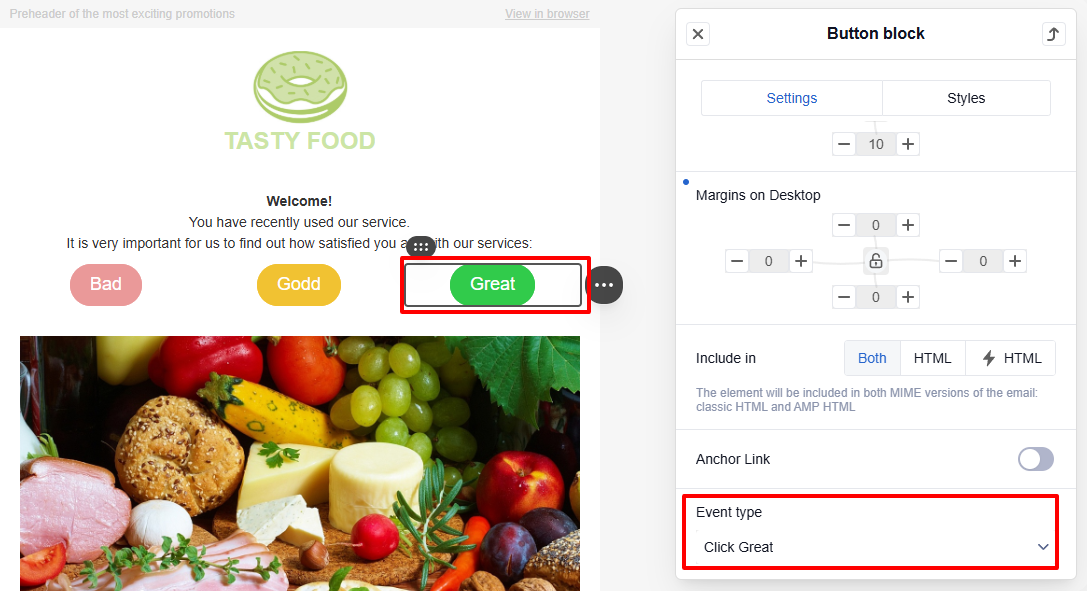 - Link the event to the button in the email. To do this, click on the block with the button and select the event on the toolbar's left side.
