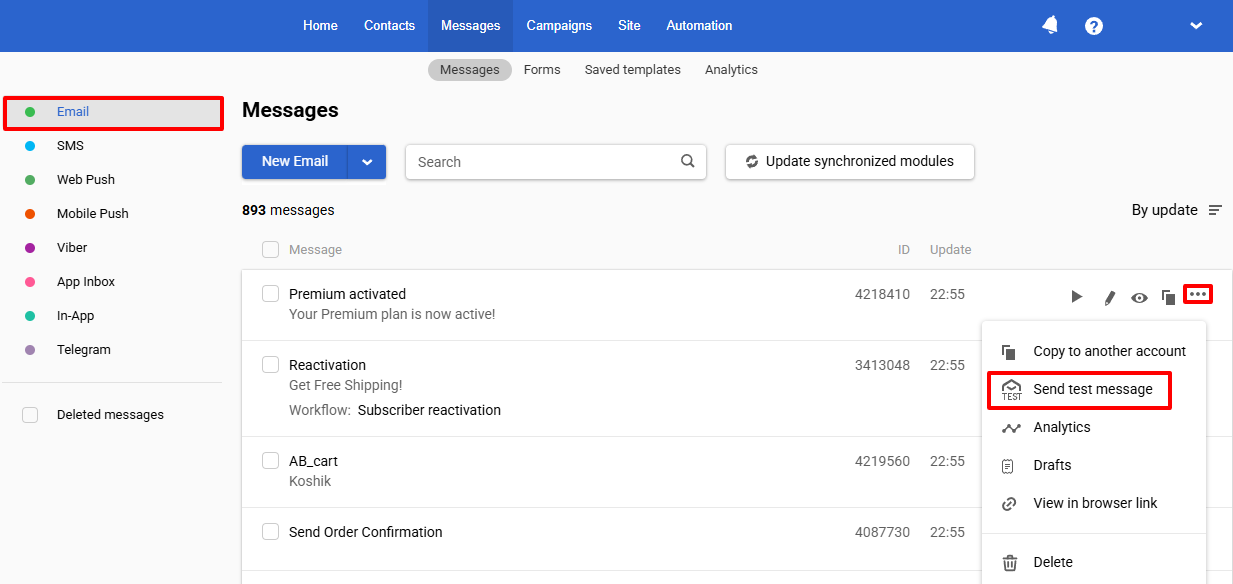 - From the message list — open the menu with three dots to the right of the message name and select Send test message.
