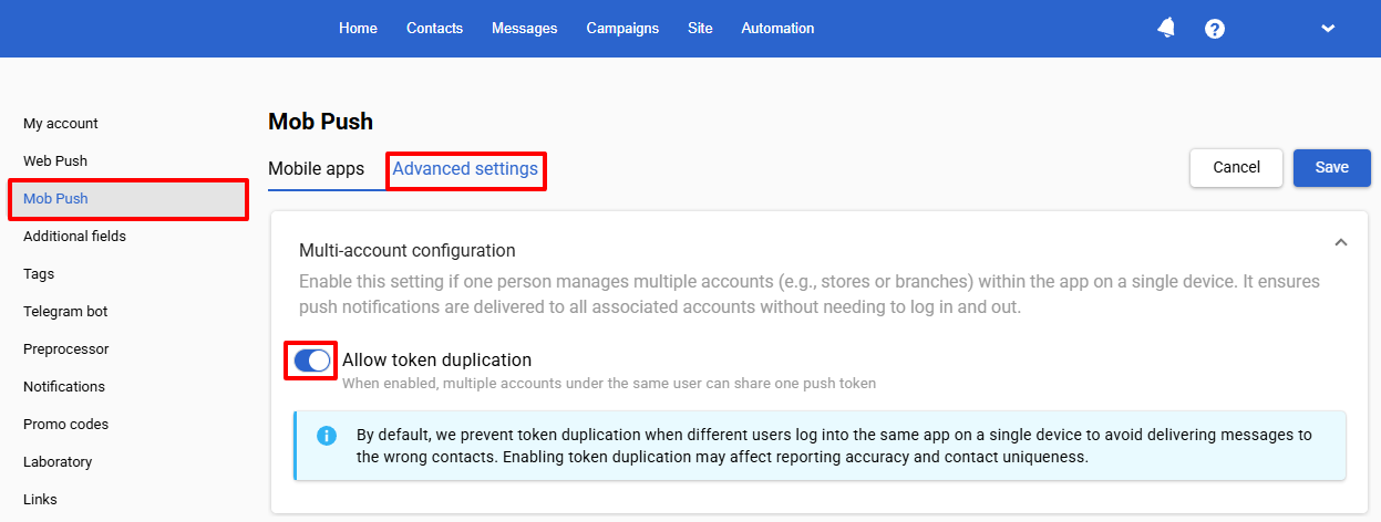 NoteBy default, the system prevents token duplication when different users log into the same app on one device, helping avoid sending notifications to the wrong contacts. Enabling duplication may affect report accuracy and the uniqueness of contacts.
