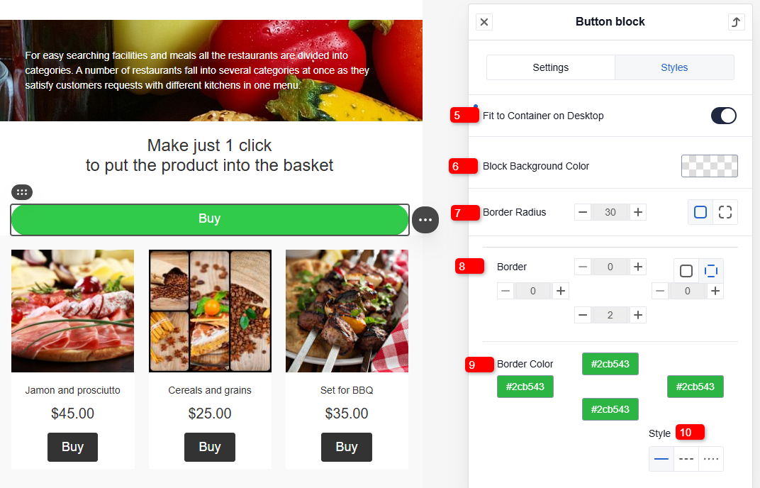 - Fit to container — if enabled, the button will occupy the full width of its container in the desktop version.