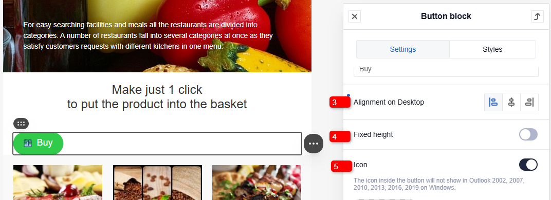 - Hide element — enables hiding the button in the desktop or mobile version of the email.