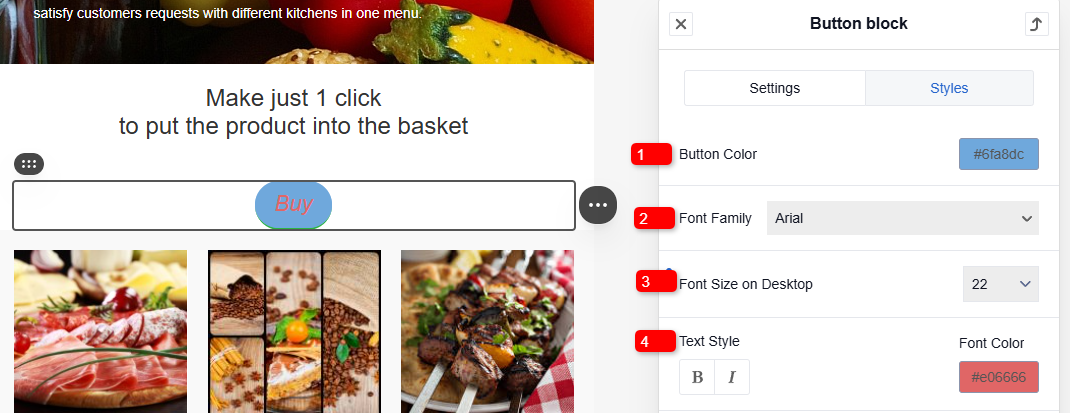 - Icon — adds an image icon displayed inside the button (for example, a cart or arrow icon).
