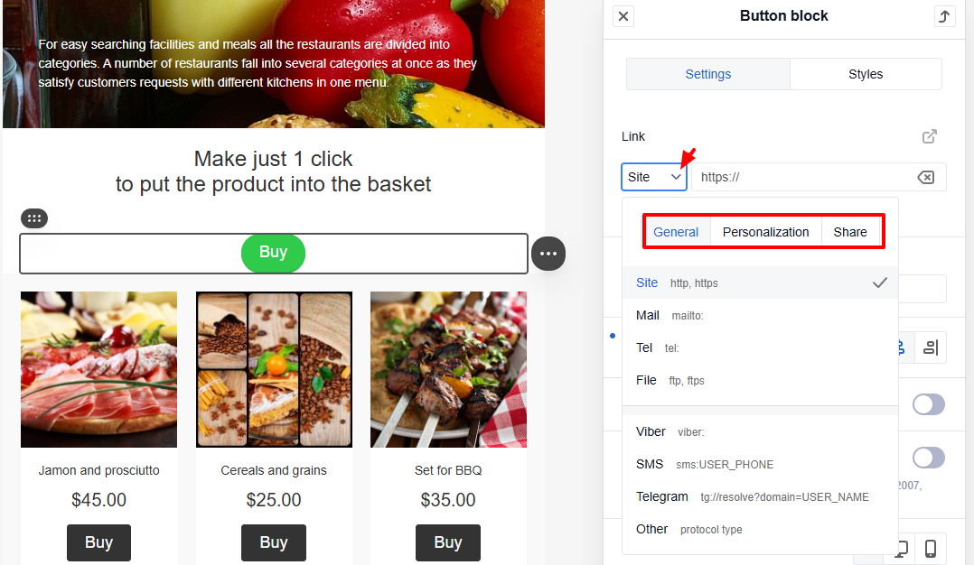 In the button settings, you can select the link type. This determines where the user will be redirected after clicking.