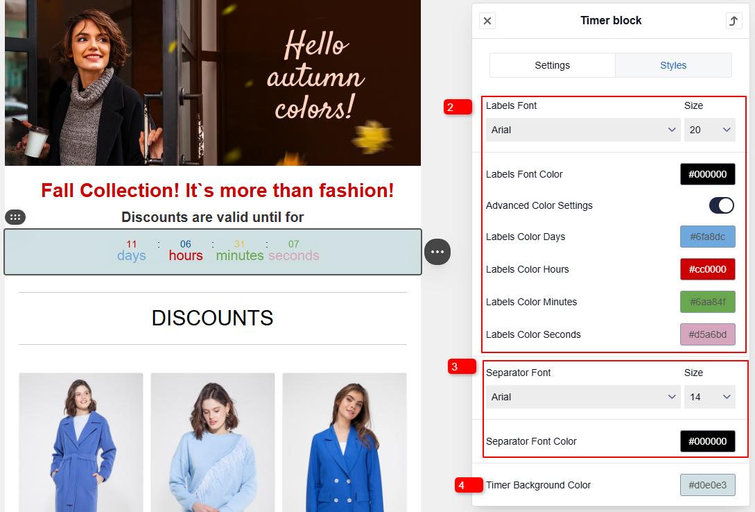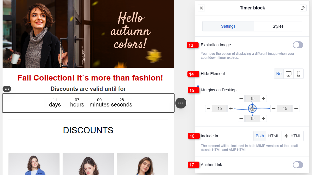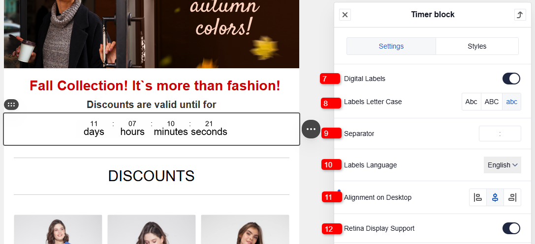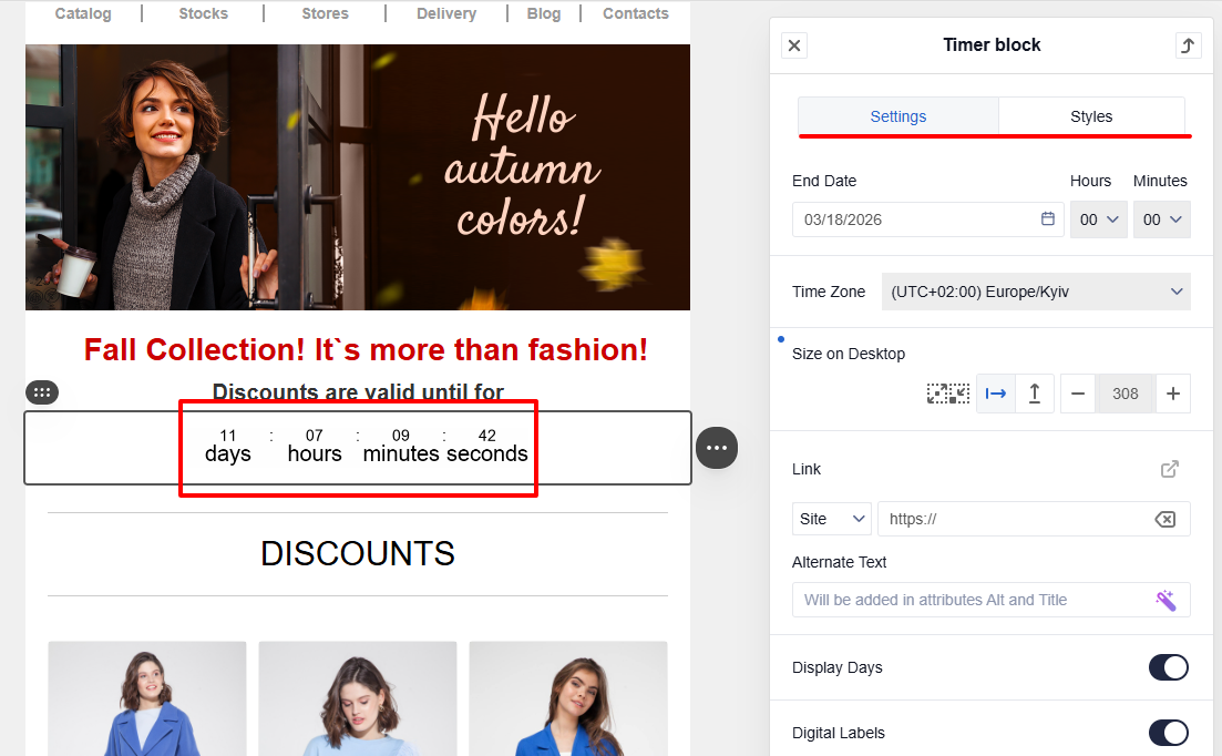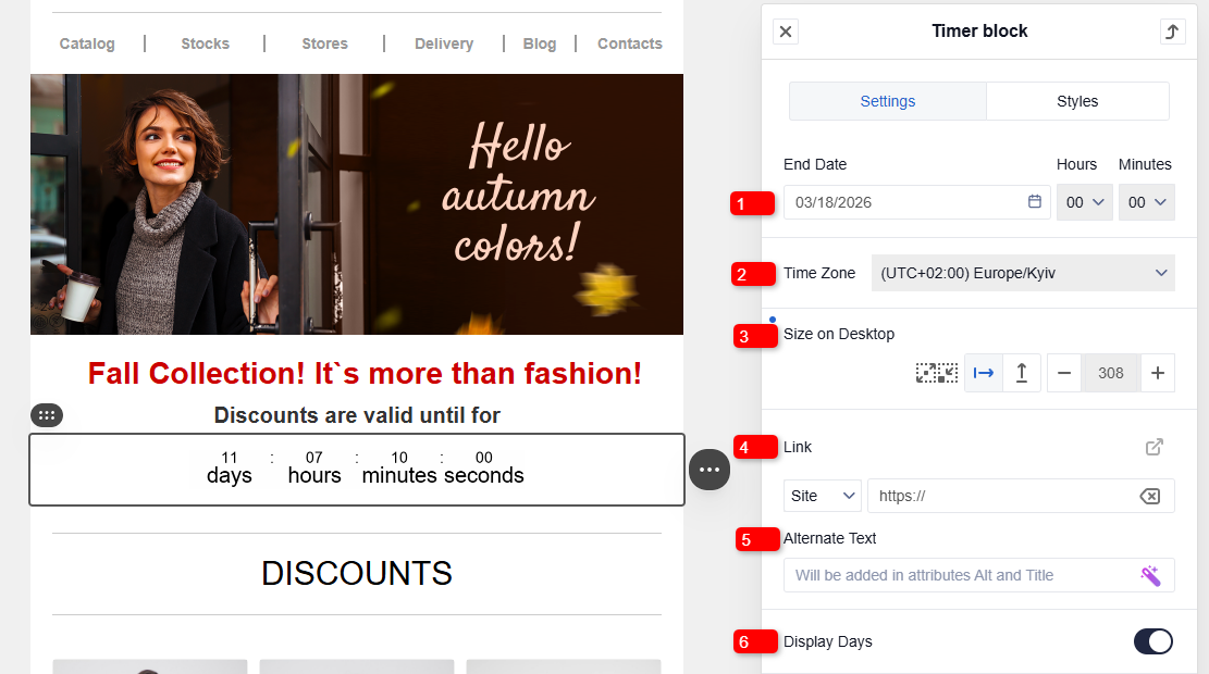 - End date— set the moment when the countdown ends. The timer stops after this date.