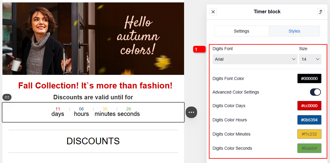 - Display days — display or hide the day counter. If you disable this option, the timer shows the countdown in