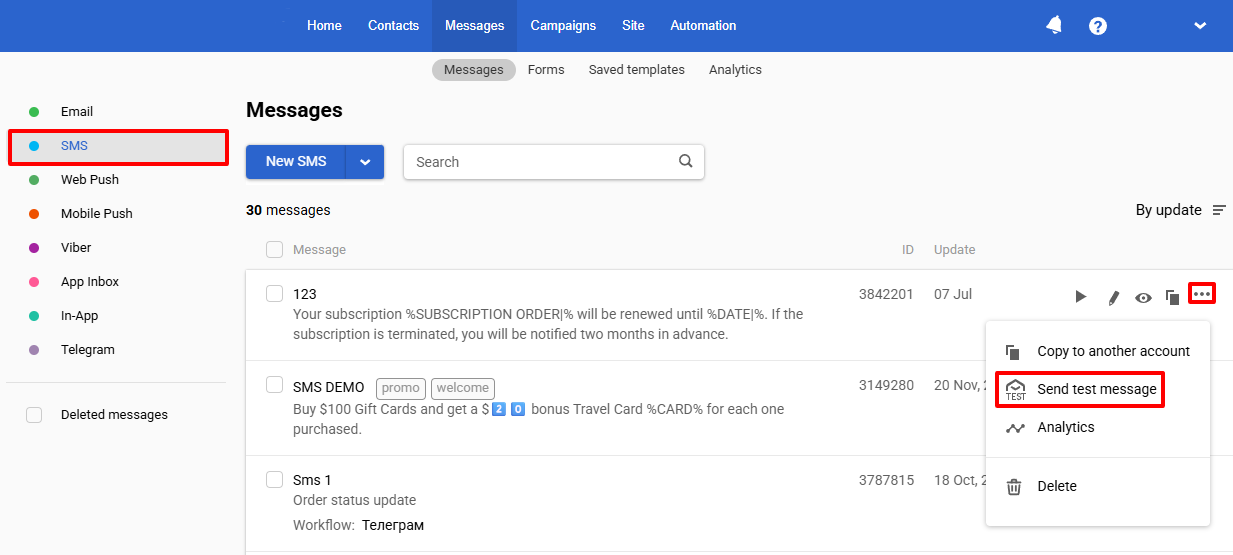 - From the message list — open the menu with three dots to the right of the message name and select Send test message.