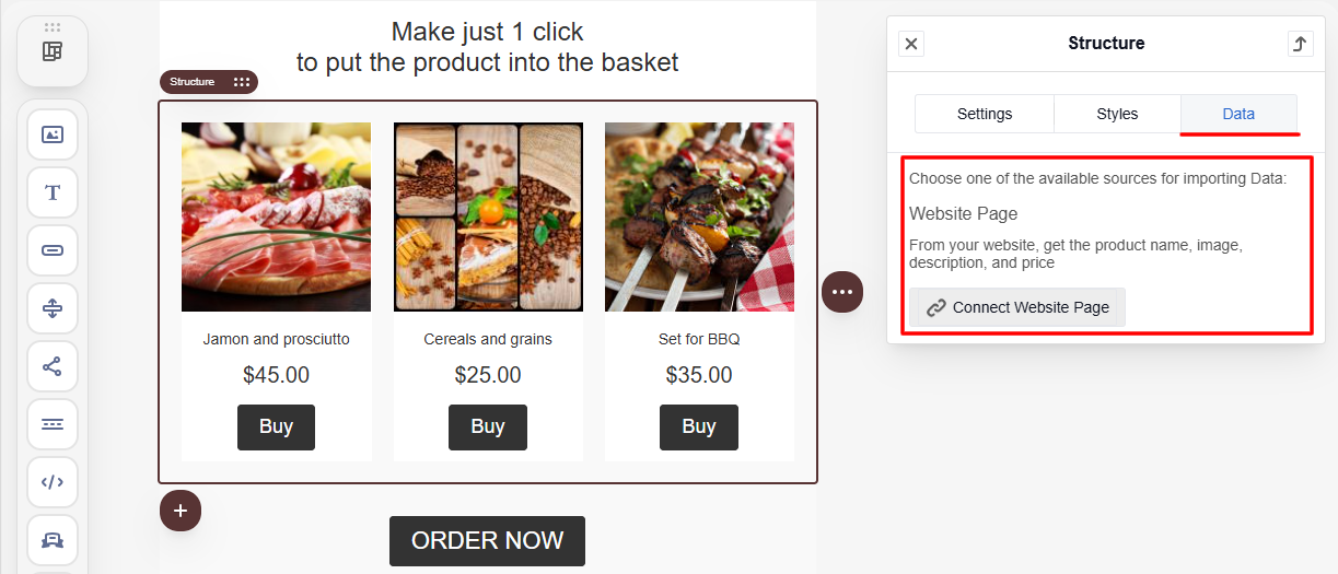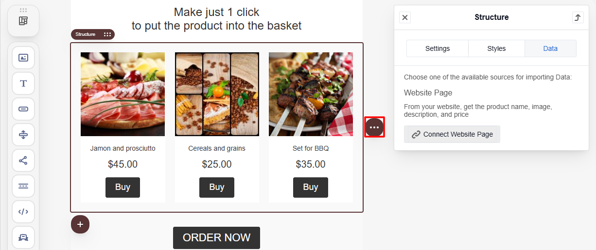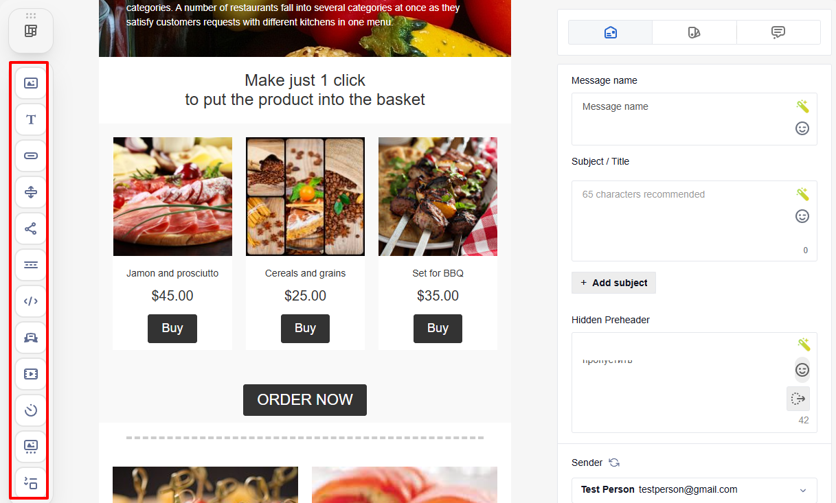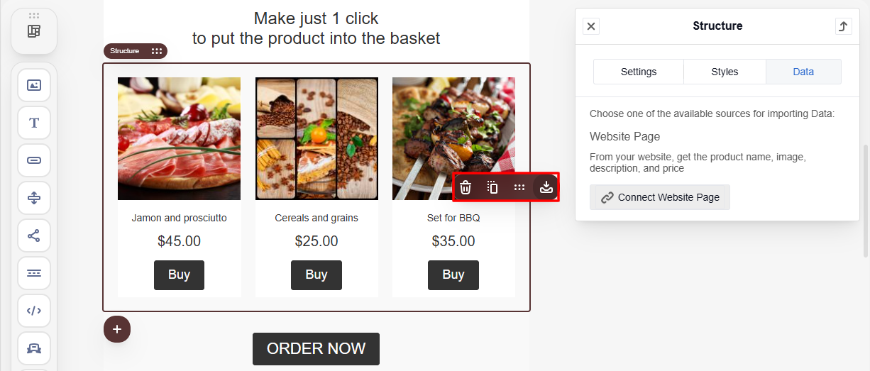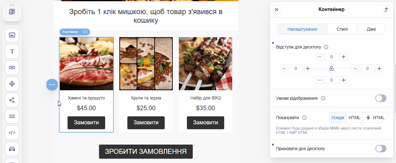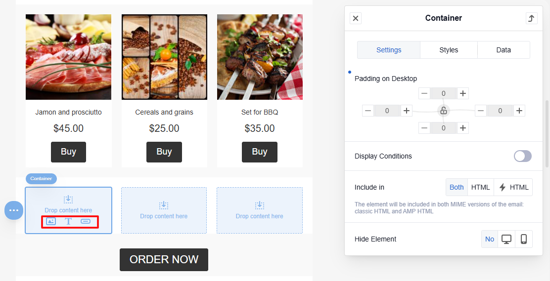 NoteIf the container is empty, quick-add icons for basic blocks (image, text, button) appear inside it. Click the required icon to add a block without dragging it from the panel.