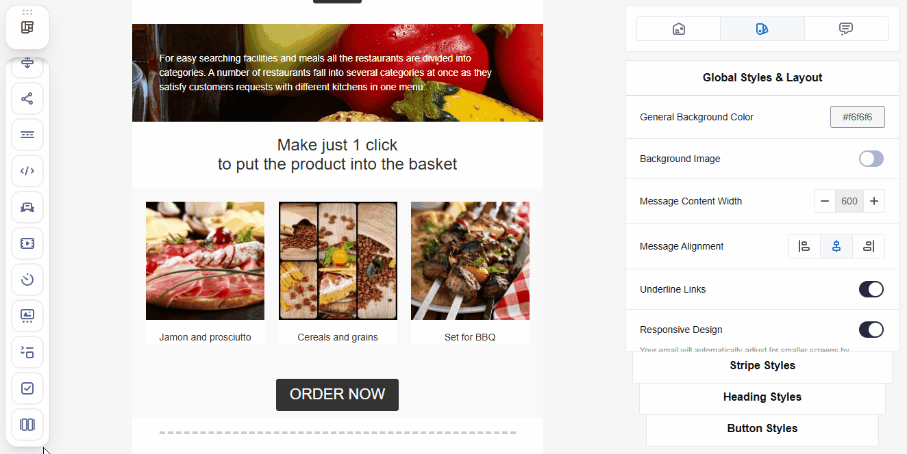 To flexibly create emails that display correctly in all email clients (Gmail, Outlook, Apple Mail) and on different devices, the editor uses a four-level hierarchy: Stripe → Structure → Container → Block.