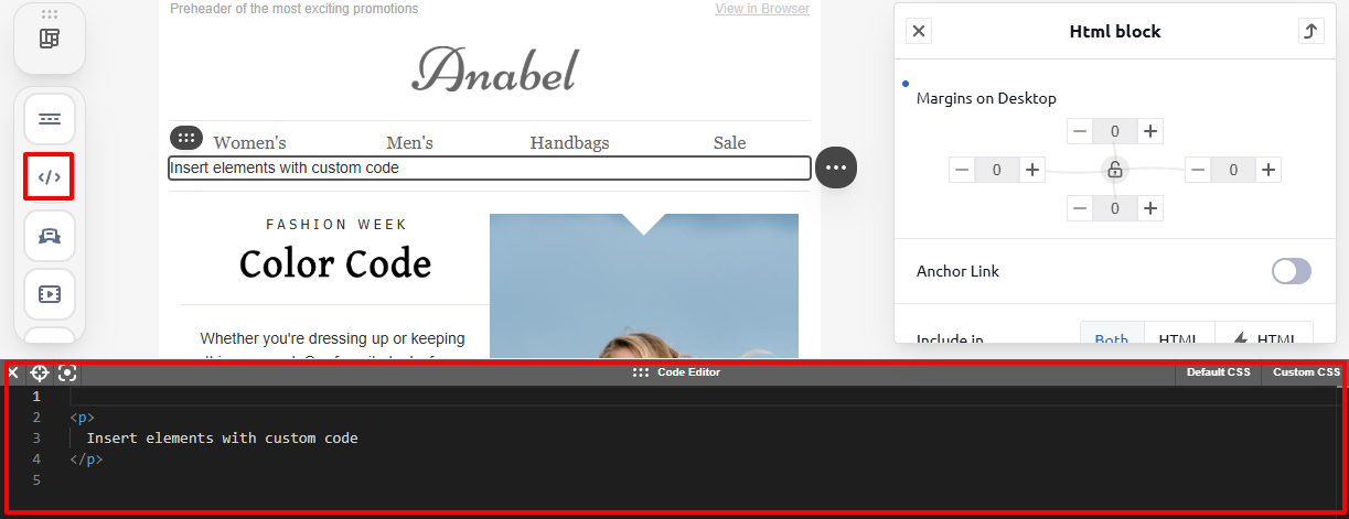 The HTML block is intended for adding your own HTML and CSS code. Note that only the functions of editing pictures and links will be available from the entire adaptive editor. The user configures the adaptability independently.