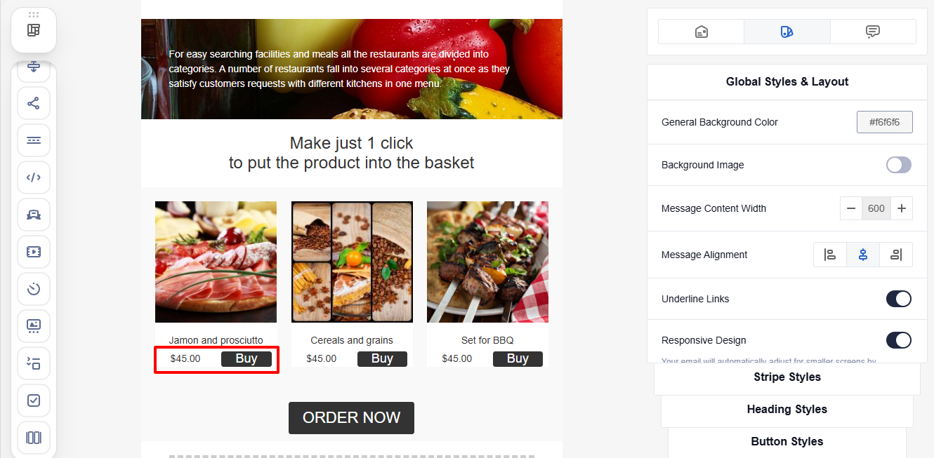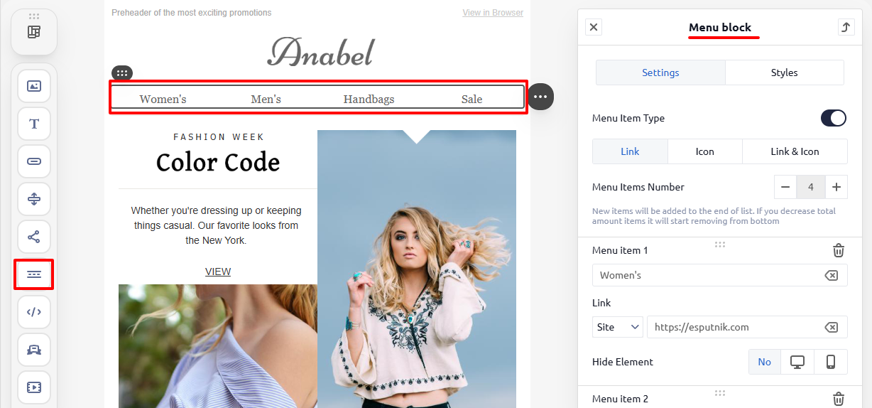 The Menu block is placed in almost all emails. You can add it both in the header and in the footer. The menu is an easy way to add small CTAs if, for example, the user is not interested in the campaign offer but knows what they want to see on the site. Usually, the block from campaign to campaign stays the same.