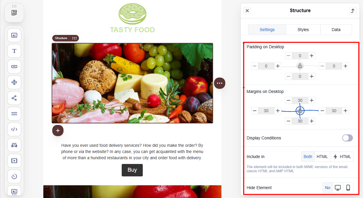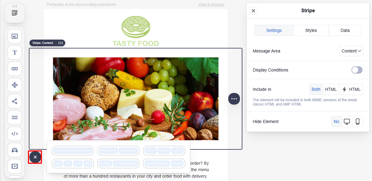- Hide element — hide the element in the desktop or mobile version of the email.