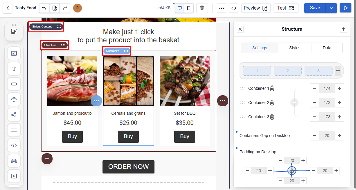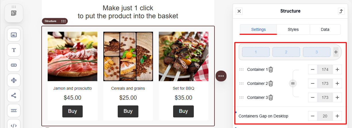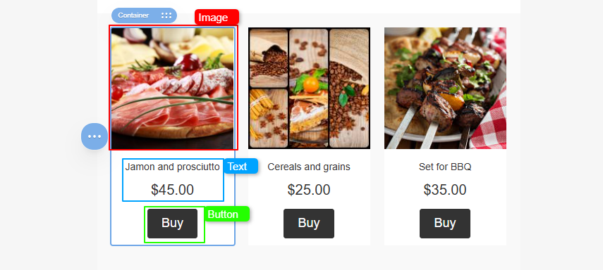 A Container groups content inside a Structure. You place blocks inside containers — for example, to create a product card.