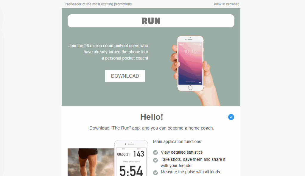 - Info area — placed above the header or below the footer and contains service links (for example, view in browser or unsubscribe links).