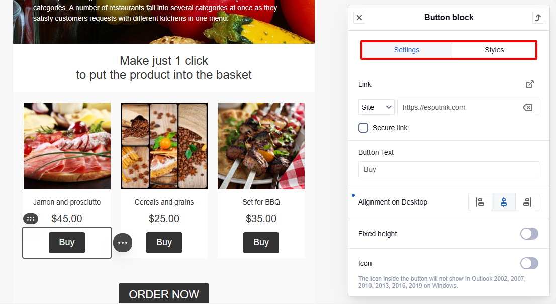 - Settings — define the block’s behavior and display conditions in the email: links, spacing, alignment, display conditions, and more.
