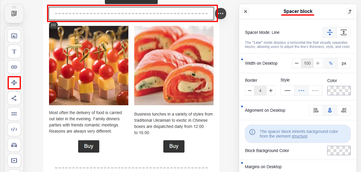 The spacer helps visually separate different content blocks. In the block settings, you can select the line type, color, adaptivity, etc.
