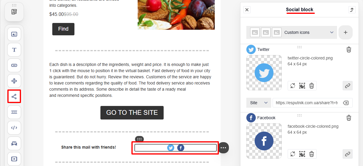 Adds links to the brand’s social media pages — Facebook, Instagram, and others.
