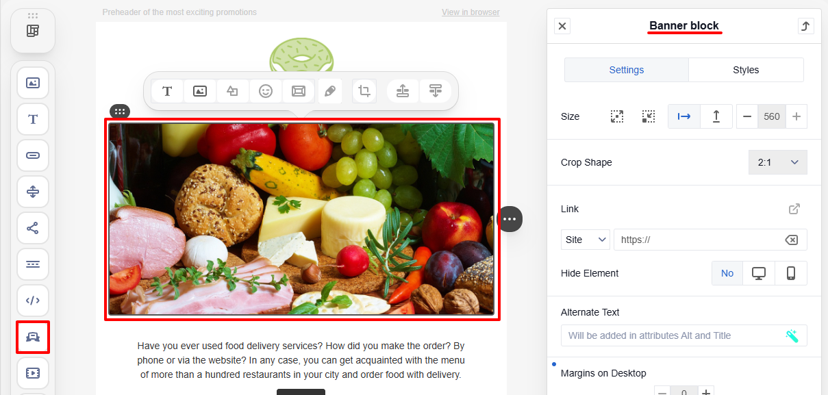 Displays a large visual element for the main message of the email. Image editing tools are available, similar to those in the Image block.