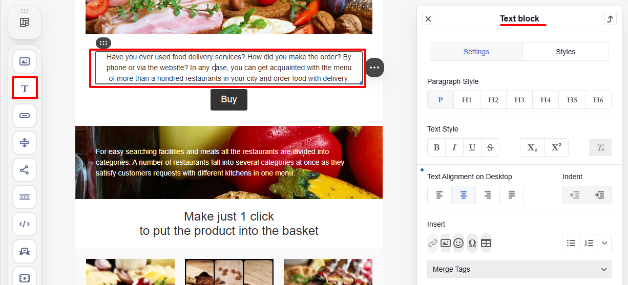 The text block has a built-in editor that allows you to change the font, background color, indents, etc. In addition, the text generator using artificial intelligence is at your service.