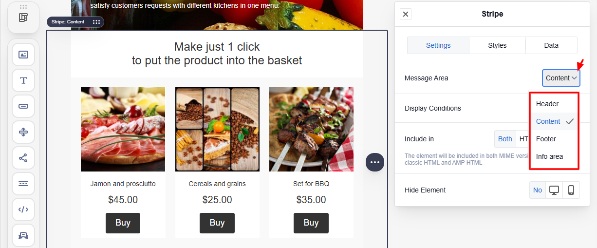 - Stripe — configure the email area (Header, Content, Footer, or Info area);