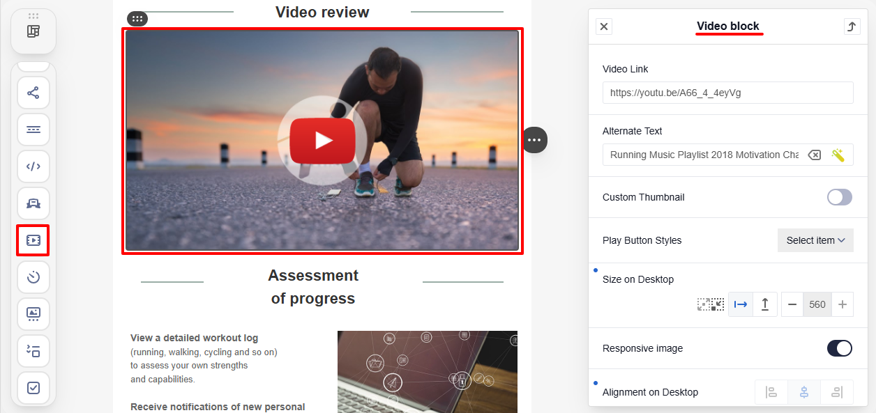 You can add a video link, configure alt text, use a custom preview image and choose the play button style. Set the preview size for desktop in the block settings.