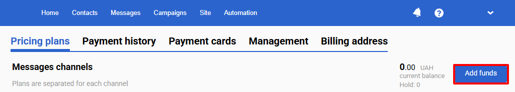 Click the Add funds button on the main account page. When replenishing via built-in systems, funds are credited automatically.