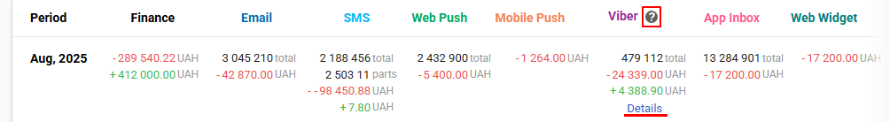 For a more detailed overview of Viber channel billing, click the help icon next to its name. If you need to view detailed tariff information, click Details — a menu will open with a monthly breakdown of expenses, refunds, and the number of delivered messages.