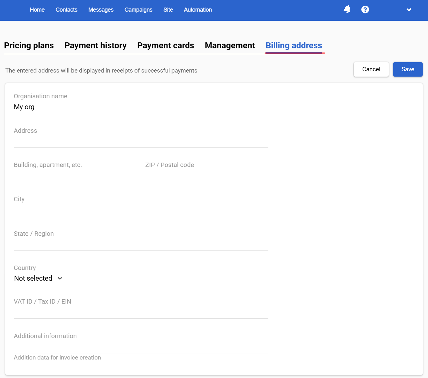 To add a billing address, click Pricing plans on the account homepage, go to the Billing address tab, and fill in your organization’s details. All fields are required except for Additional information.