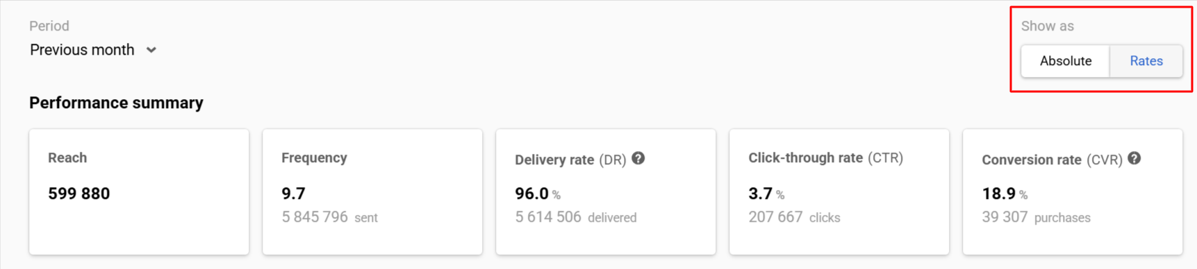 | Delivery rate (DR) | (Delivered ÷ Sent) × 100% | (Delivered ÷ Sent) × 100% per channel | (Delivered ÷ Sent) × 100% per workflow | (Deliveries ÷ Sent) × 100% per broadcast |