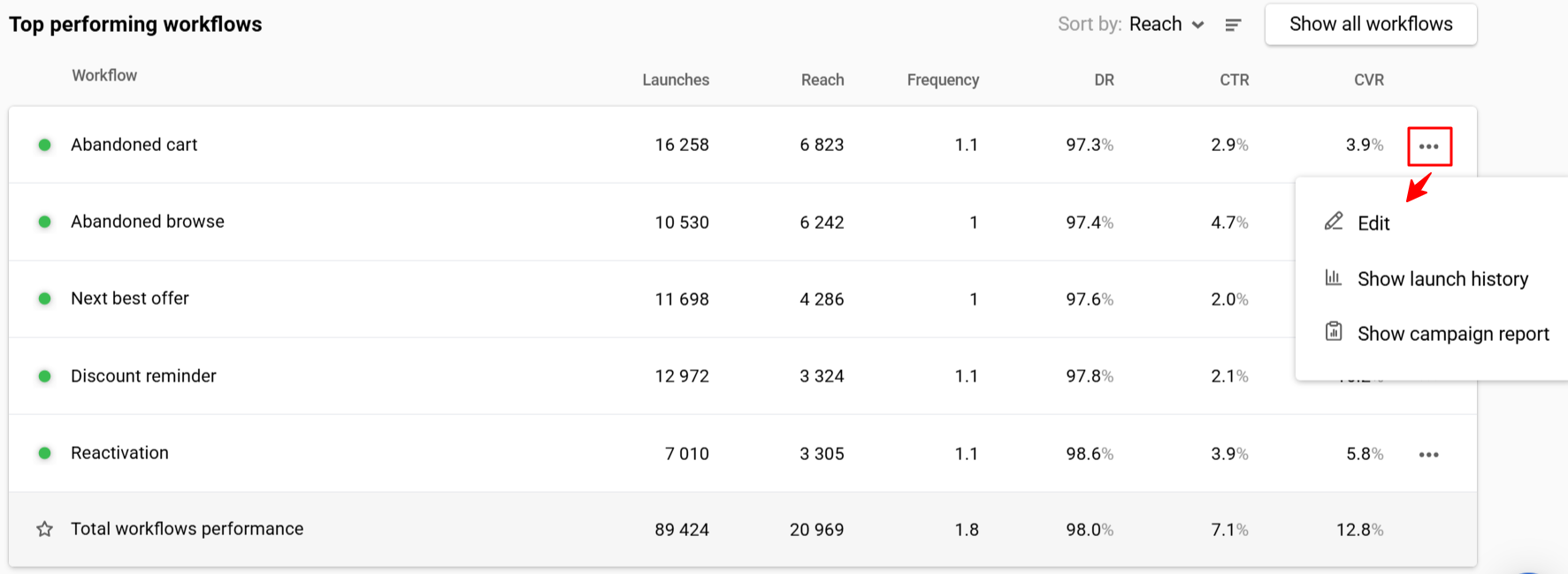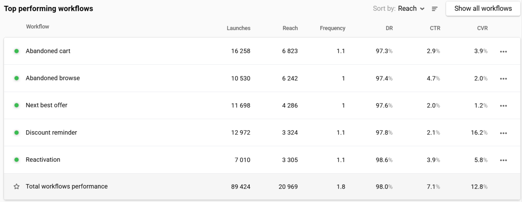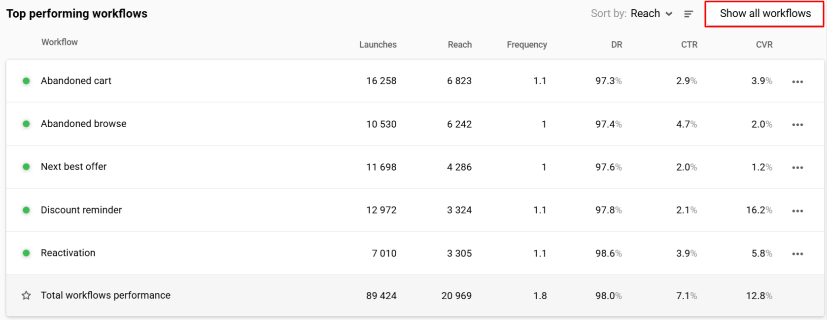 | Frequency | Sent ÷ Reach | Sent ÷ Reach per channel | Sent ÷ Reach per workflow | — |