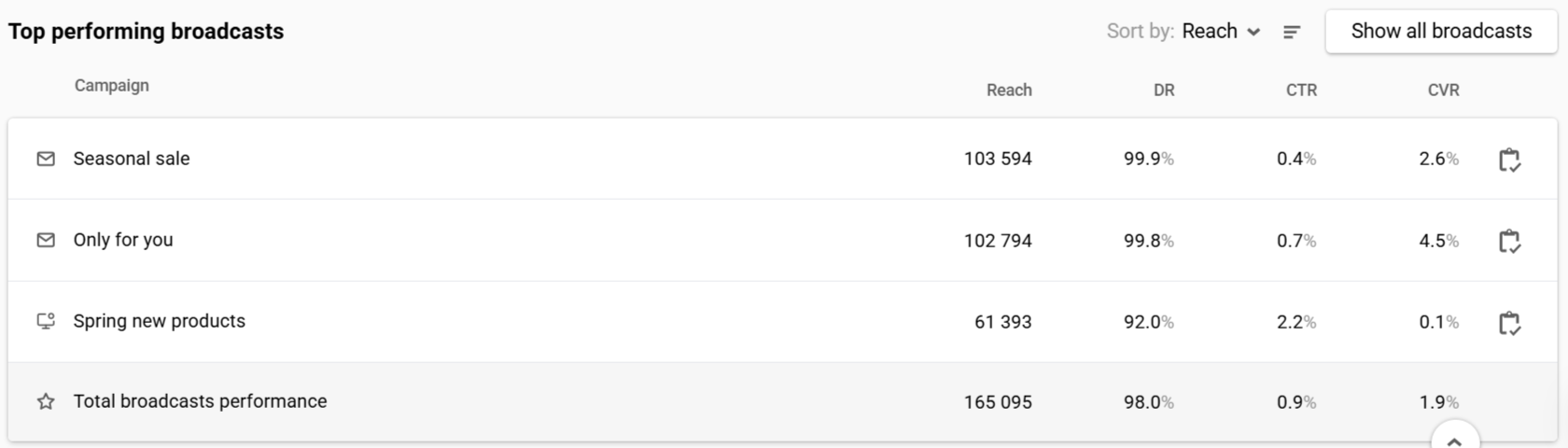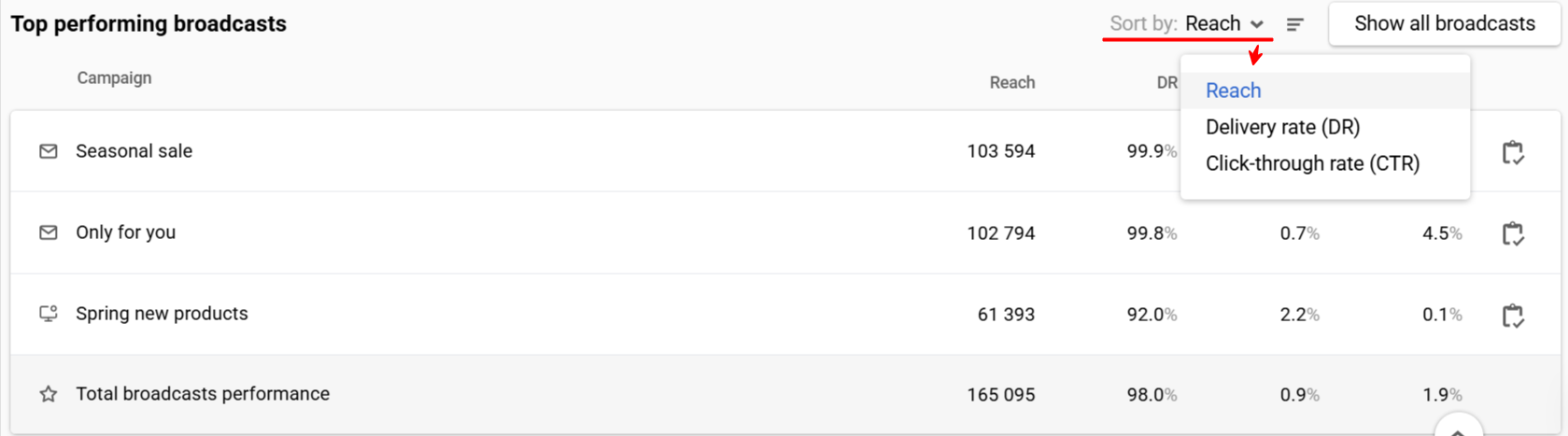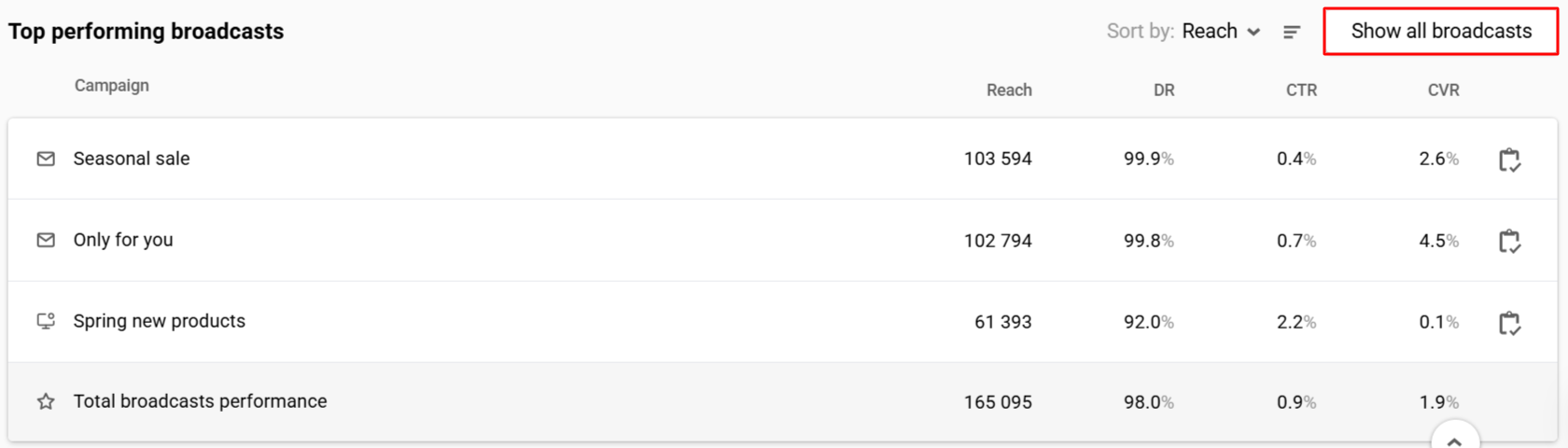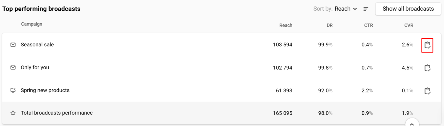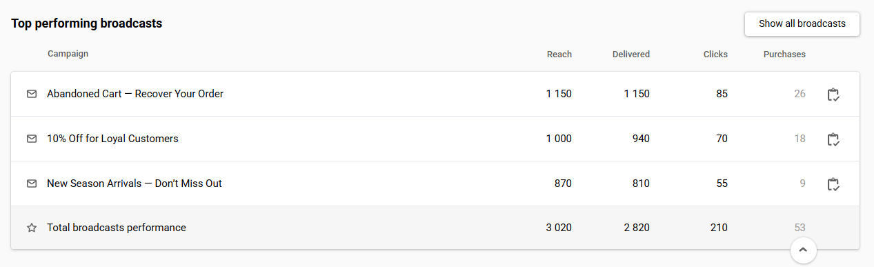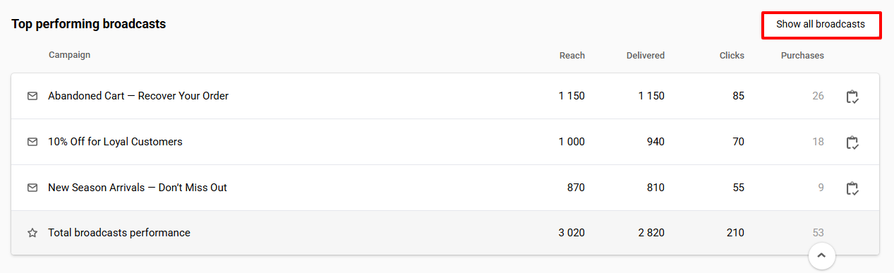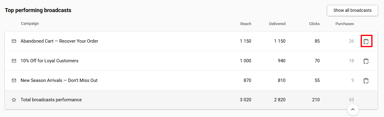 - Show campaign report: Clicking the icon next to the broadcast name navigates to its report.