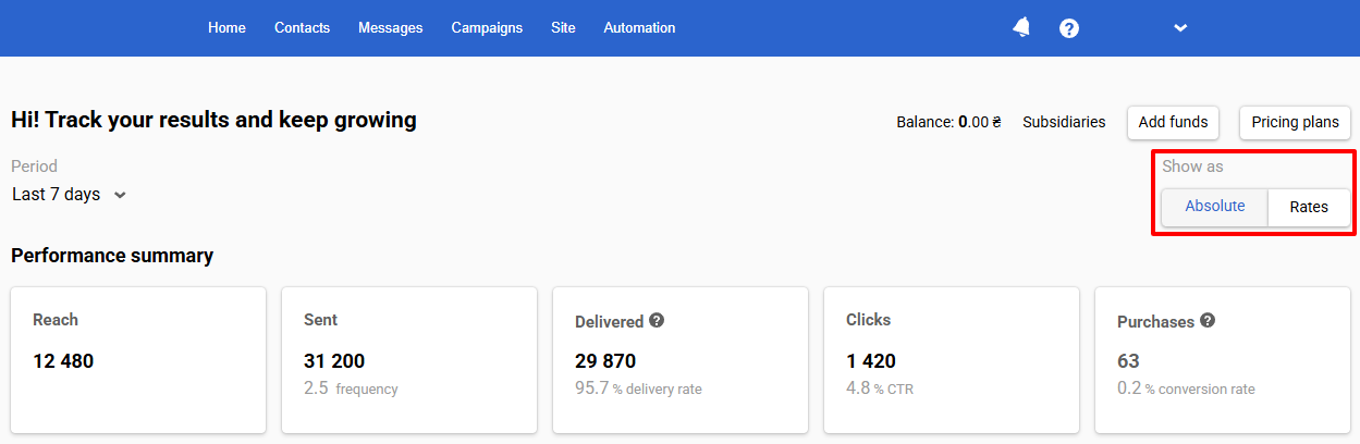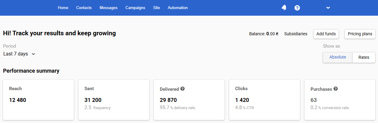 They display the overall results of triggered and bulk campaigns across all communication channels for the selected period and help quickly assess trends in contact engagement.