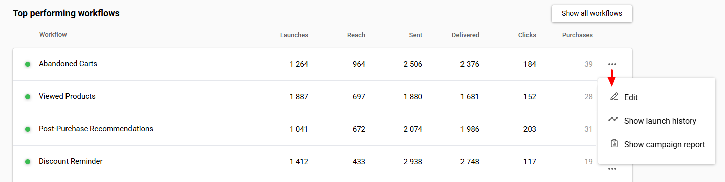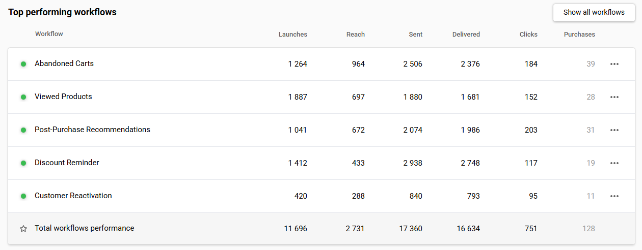 | Purchases | Total purchases per all messages | Purchases per channel | Purchases generated within each workflow | Purchases generated per broadcast |