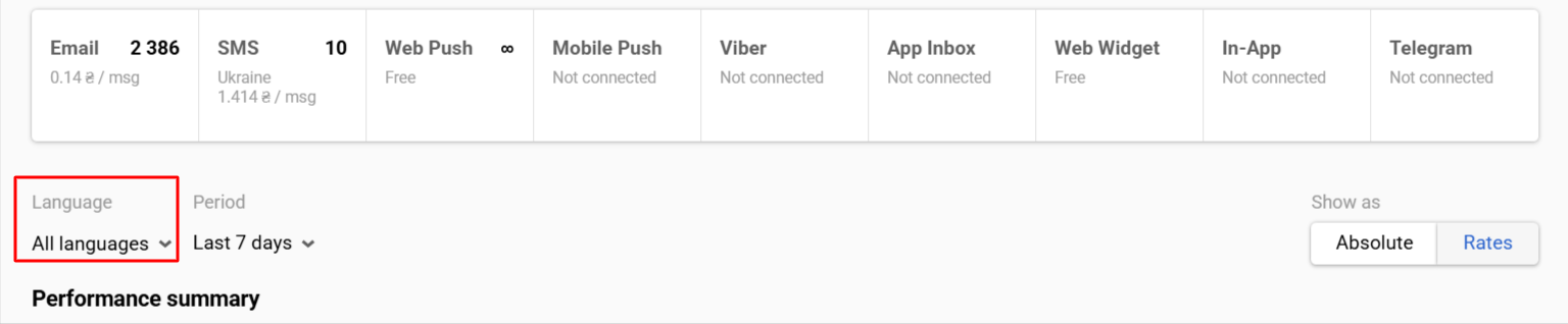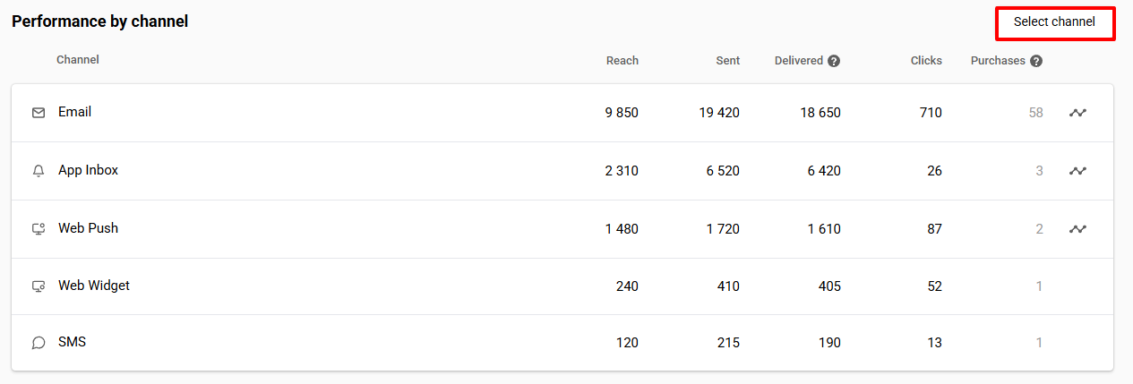 - Select channel: Choose the communication channel (e.g., Email, SMS, In-App) for which you want to view performance metrics.