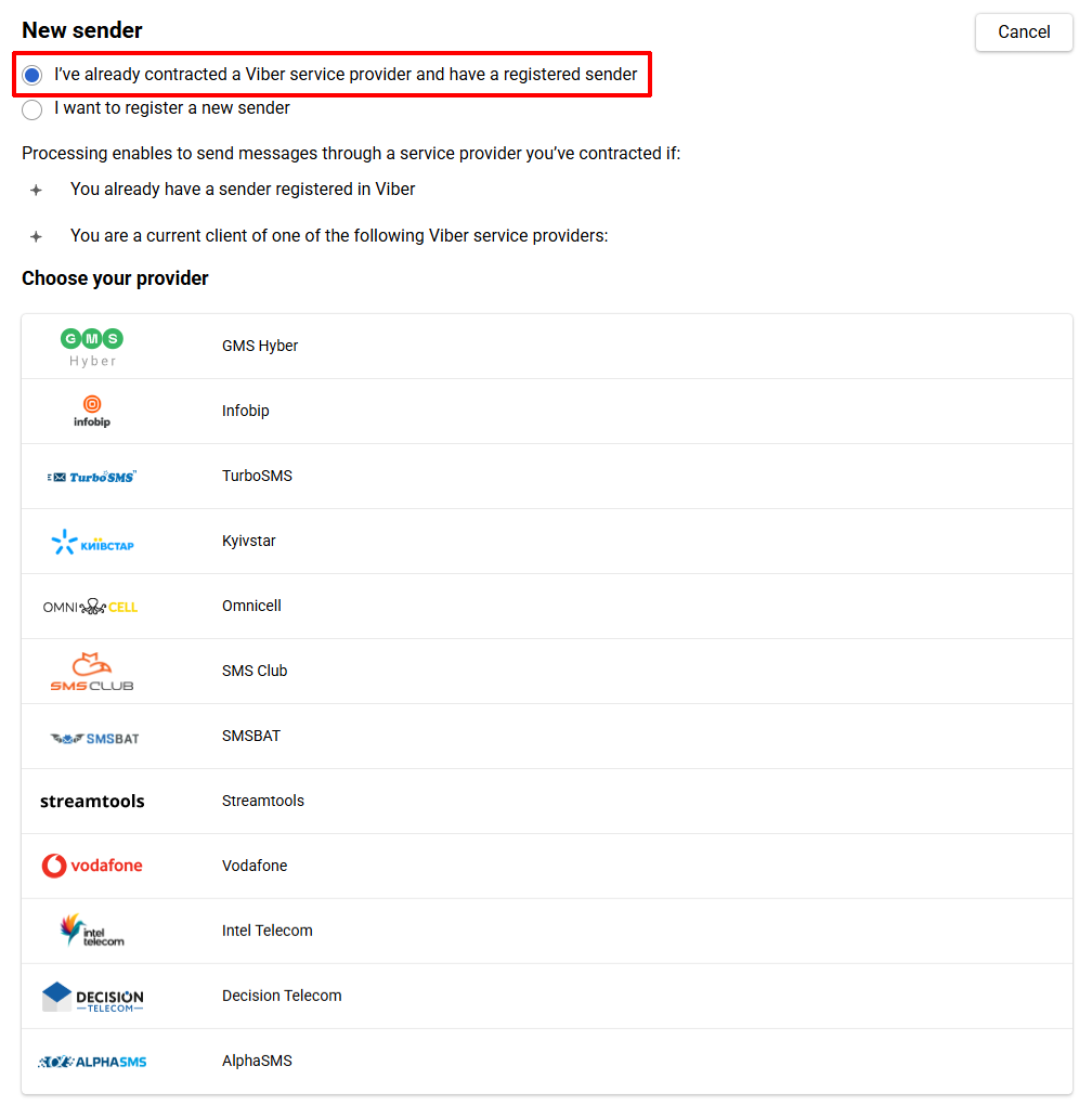 - Select the I’ve already contracted a Viber service provider and have a registered sender option and specify the provider you work with.