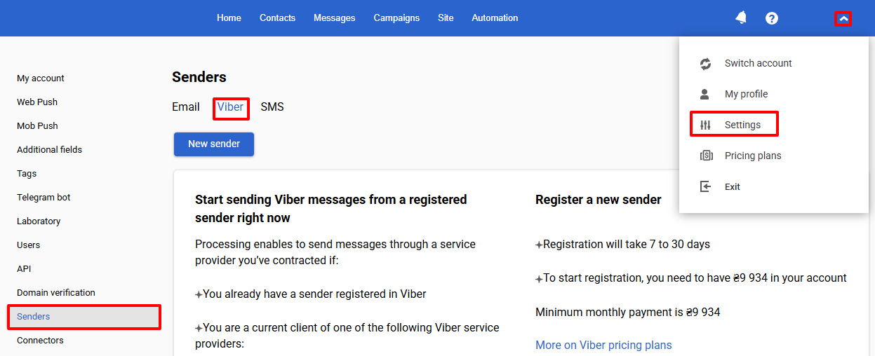 - In your profile, go to Settings → Senders → Viber.