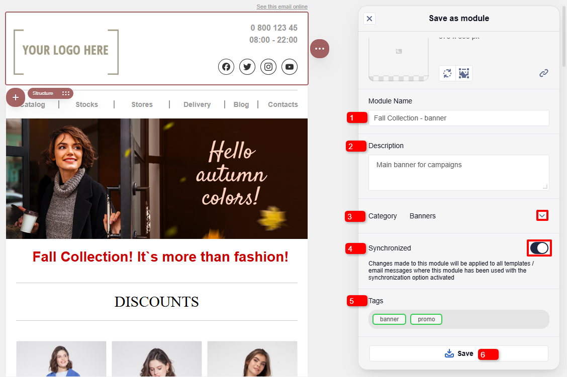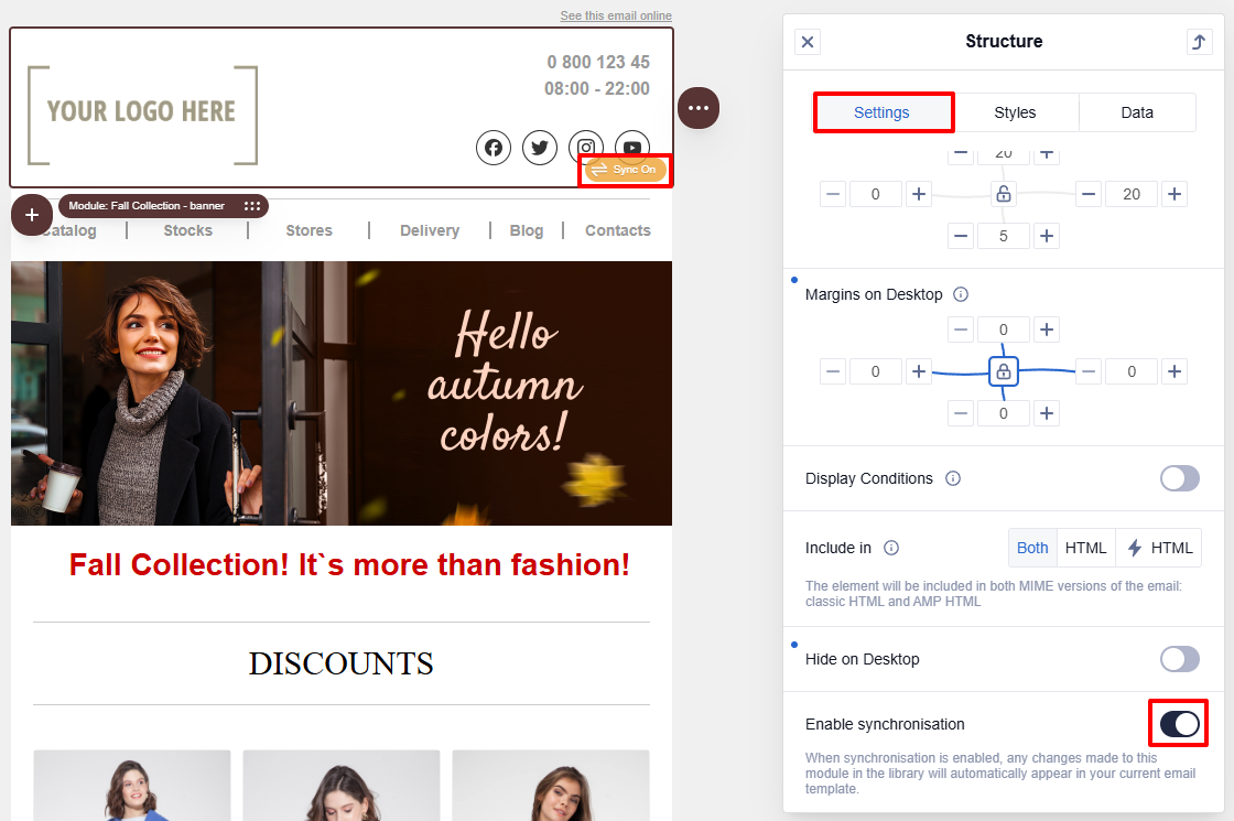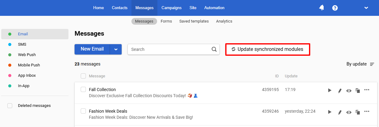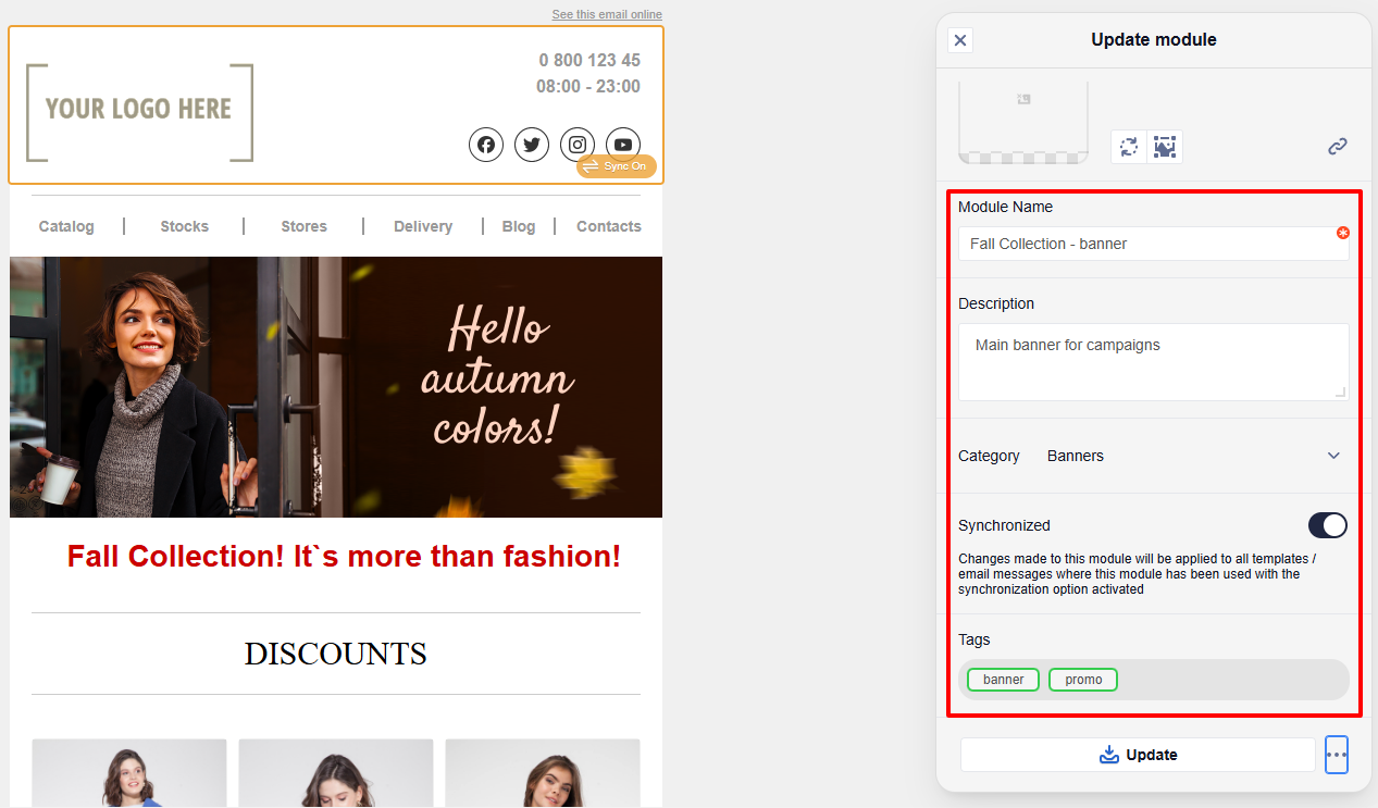 A synchronized module is an email element that can update automatically across all templates where you use it. This helps you avoid editing each email manually and works especially well for triggered campaigns.